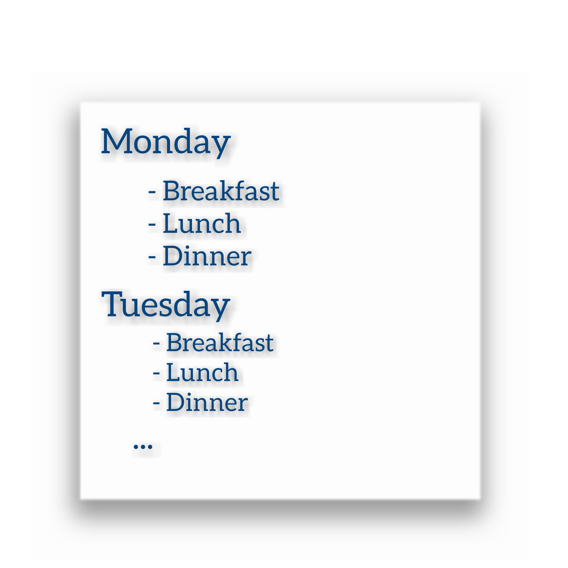 Then start adding recipes into upper right part of the paper, asking each member of your household to do the same into three groups: breakfast, lunch and dinner.